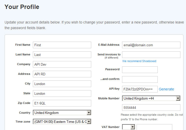 In your VPS.NET account, you will need to generate an API Key, under [Profile], to allow API requests on behalf of your account. Make note of both the API Key and Email Address fields set here, as you will enter them in Blesta.