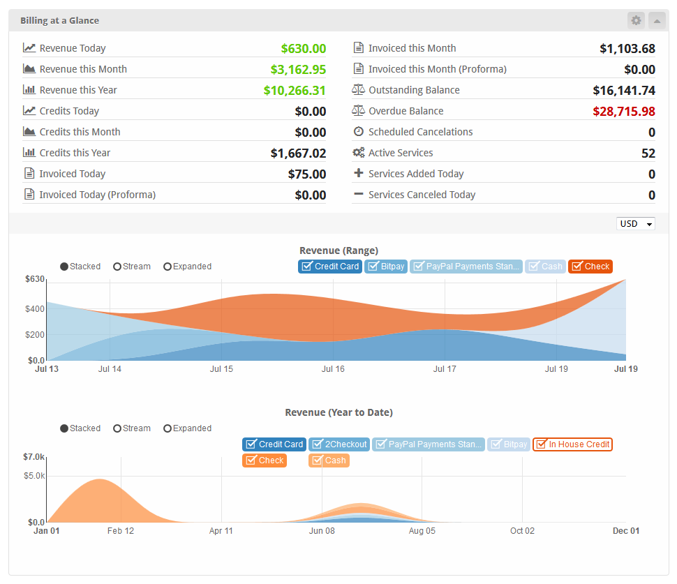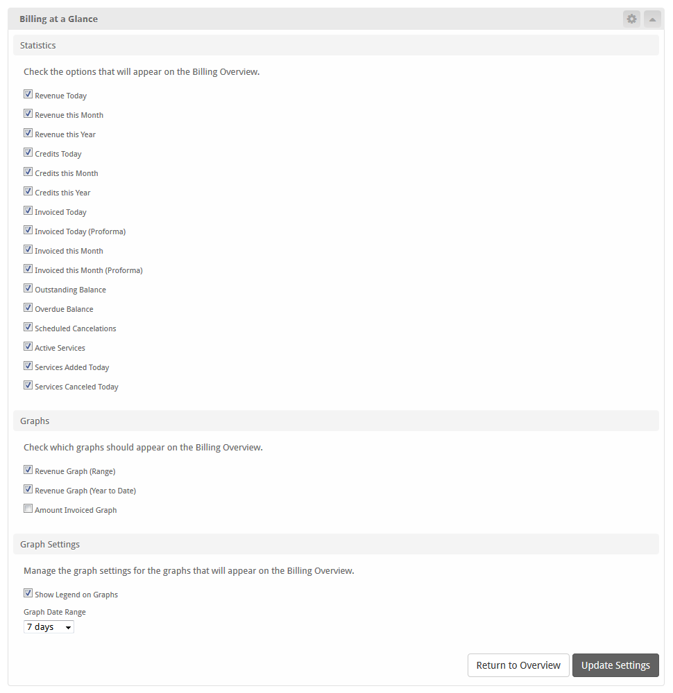 Billing at a Glance renders a widget under Billing > Overview with billing graphs and stats.