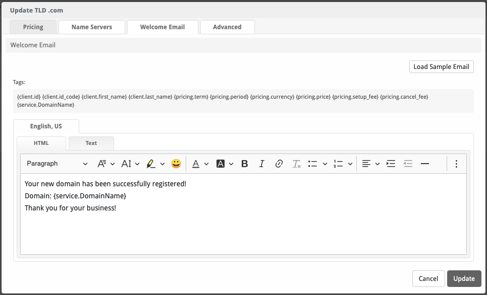Similar to the welcome email in the packages, this one contains information about the registered or transferred domain. If you are not sure or need help on how to structure the email, you can load an example provided by the module by clicking on the "Load Sample Email" button. (The availability of this feature will depend on whether the registrar module implements such functionality and may not be available for all TLDs or registrars.)