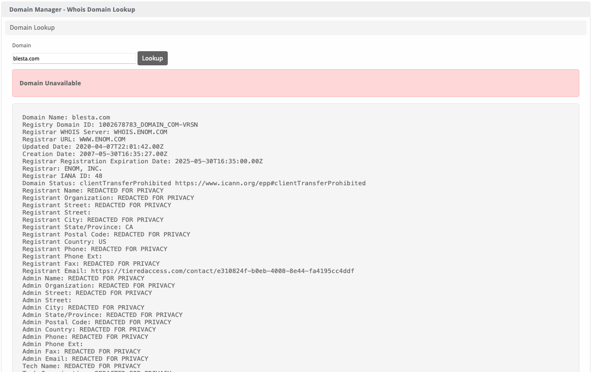 The plugin allows from the Staff area to lookup for the WHOIS information of a domain as well as verify its status and availability. To obtain the information of a domain, visit [Domains] > [Whois] and enter the domain to be queried in the "Domain" text field, and then click the "Lookup" button. Currently this feature does not support all TLDs, to see a complete list of supported TLDs, please visit the following link.