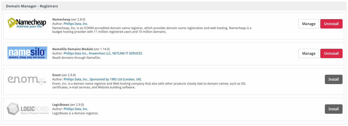 The Domain Manager is responsible for handling the registration, renewal and provisioning of domains, as well as managing the pricing and packages.