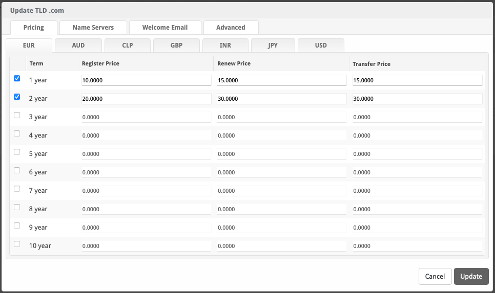 This tab allows to change the prices for this TLD in all of the currencies that the company has installed, as well as assign different prices for Registration, Renewal, and Transfer for periods from one to ten years. TLDs are created by default with a $0 cost for each currency; as a result, the TLD is created disabled to avoid accidentally offering it for free, you will need to manually activate the TLD after modifying the price for the very first time.