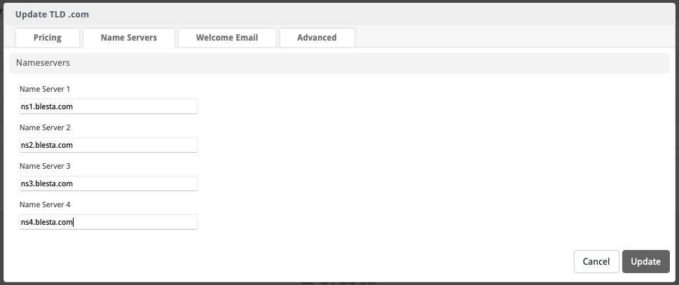 This tab allows to specify the name servers (NS) that will be used for this TLD; these NS are passed directly to the registrar module, which is in charge of updating the DNS accordingly. The NS defined here are usually available in the welcome email as tags. (The availability of this feature will depend on whether the registrar module implements such functionality and may not be available for all TLDs or registrars.)