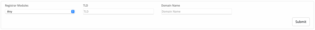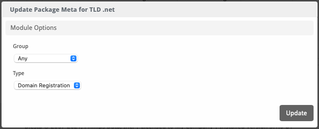 To update the registrar module of a TLD visit [Packages] > [Domain Options] > [TLD Pricing] and within the TLD listing, select in the Module dropdown the new module you desire. Only TLDs that do not have any active services can be updated; if the TLD you want to update does have active services, you must create a new TLD.