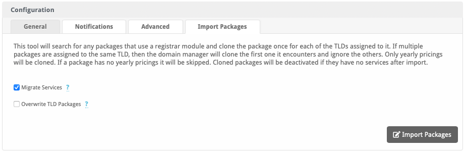 In this section you can import previously created packages that are using any of the registrar modules. If multiple packages are assigned to the same TLD, then the domain manager will clone the first one it encounters and ignore the others. Only yearly pricings will be cloned. If a package has no yearly pricings it will be skipped. Cloned packages will be deactivated if they have no services after import.