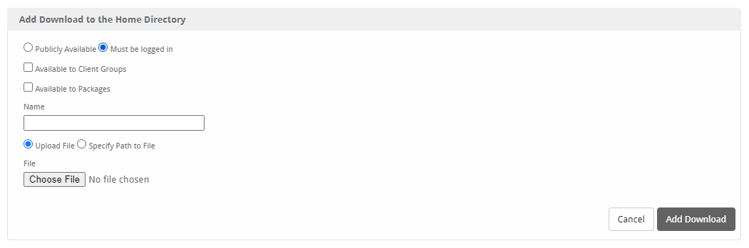 - Select Publicly Available, or Must be logged in to set the permissions required for this download. If Must be logged in is selected, the download can be restricted by client group, or available packages, or both.