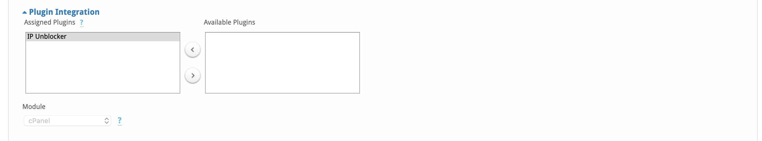 To activate the service management tab "Unblock IP" for your cPanel and Directadmin servers, edit your packages under [Packages] and move it from "Available Plugins" to "Assigned Plugins" within the Plugin Integrationsection, as shown below: