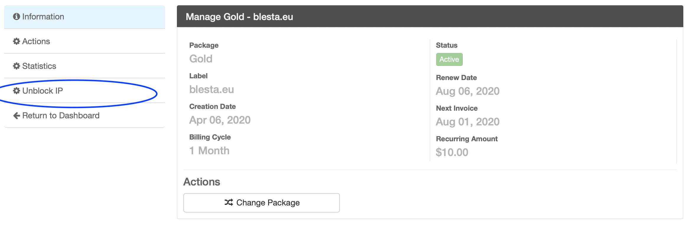 When clients click the "Manage" button next to their services for which IP Unblocker is assigned, they will see a new "Unblock IP" management tab.