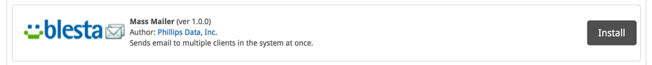 To install the Mass Mailer plugin, visit [Settings] > [Company] > [Plugins] > Available, and click the "Install" button for Mass Mailer.