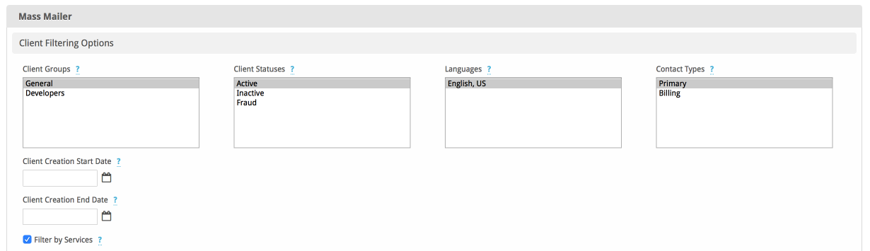 | Client Creation Start Date | Clients must have been created on, or after, this date. Leave this field blank to ignore it. |