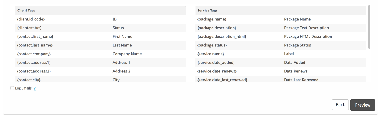 | Client Tags / Service Tags | The "Client Tags" and "Service Tags" sections describes tags that may be used in the welcome email with a description next to them to explain what they are. |