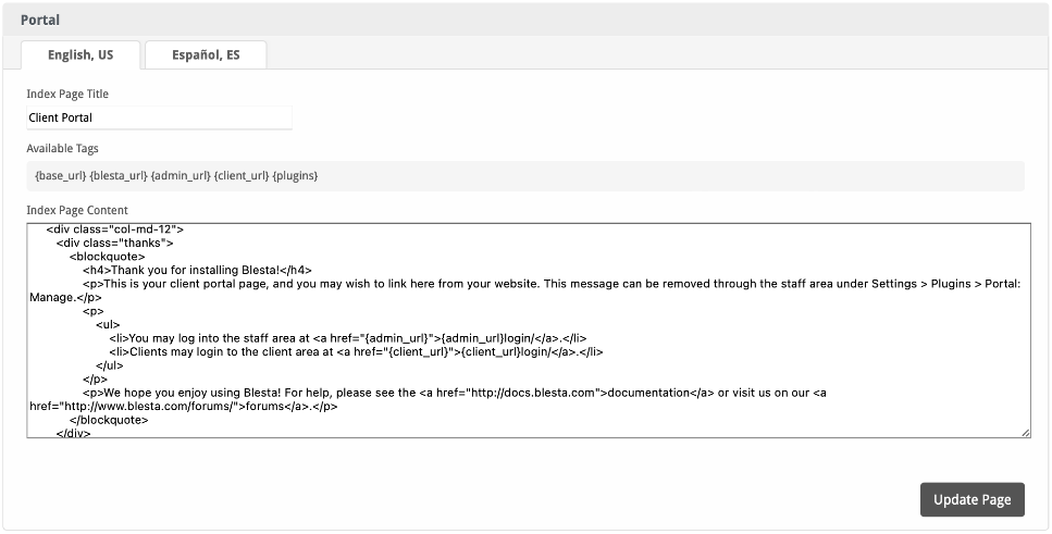 The Portal plugin is installed by default, but may need to be installed for addon companies. As of Blesta 5.12.0, the plugin allows the creation of additional custom content pages.