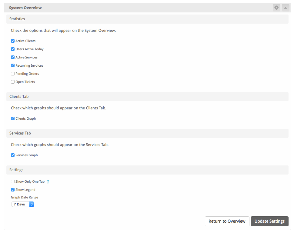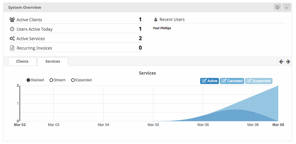 The System Overview widget is installed by default for the primary staff user, but will need to be activated for additional staff as well as within any addon companies.