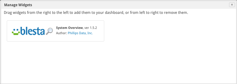 Next, visit [Home], and click the "Manage Widgets" link in the left column of the Dashboard. Drag the "System Overview" widget from the right column to the left column to add it to your Dashboard. This step will need to be repeated for each admin that wishes to have the widget appear on their Dashboard.